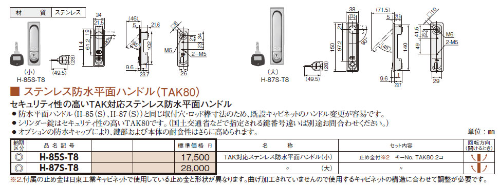 H-87S-T8 ステンレス防水平面ハンドル(TAK80)