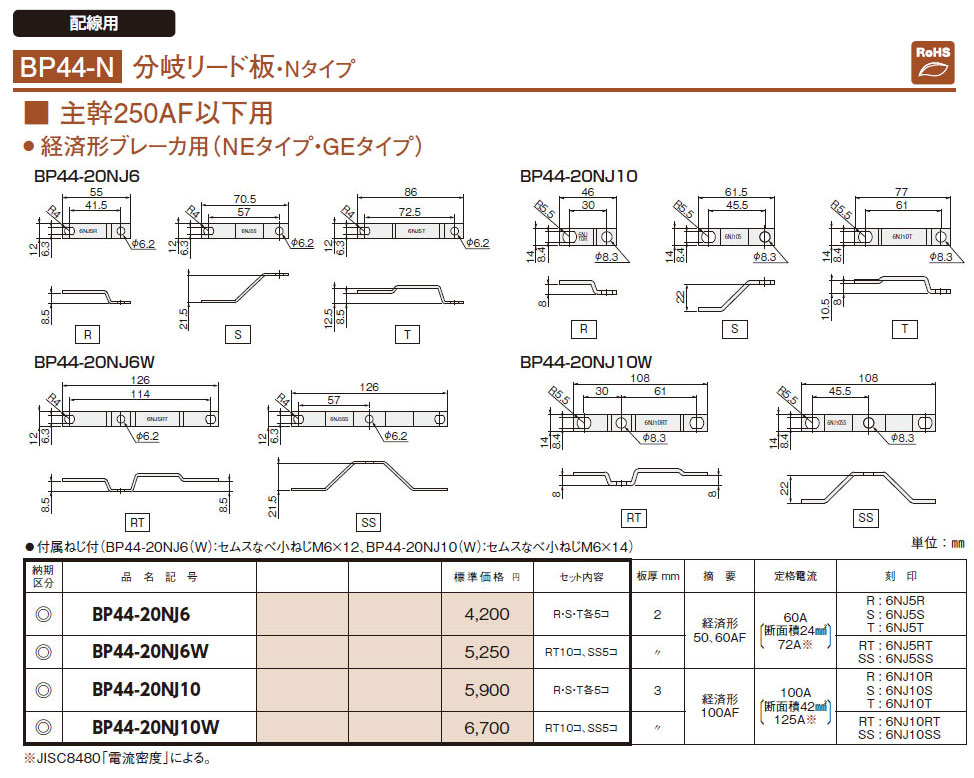 BP44-20NJ10 分岐リード板 主幹250AF以下用 経済形ブレーカ用