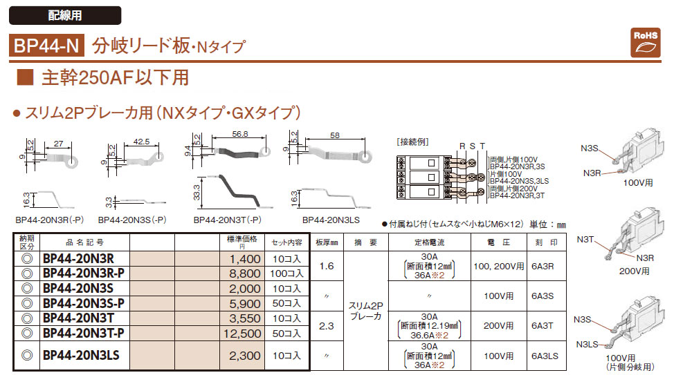 BP44-20N3S-P 分岐リード板 主幹250AF以下用 スリム2Pブレーカ用