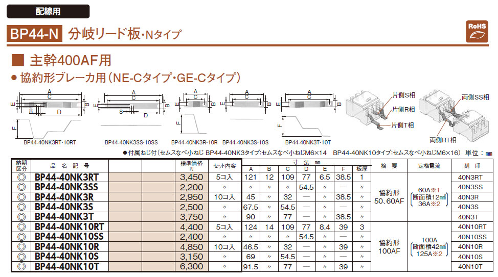 BP44-40NK10T 分岐リード板 主幹400AF用 協約形ブレーカ用