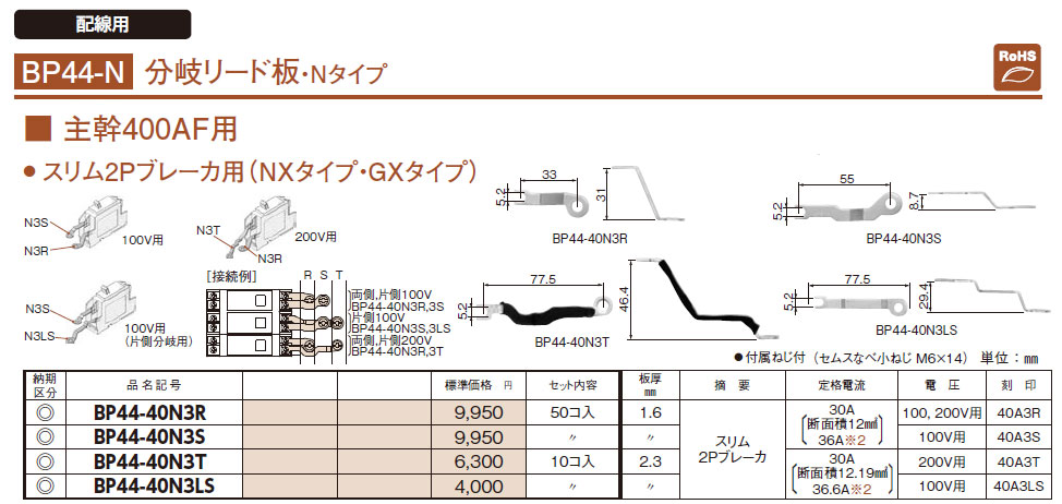 BP44-40N3T 分岐リード板 主幹400AF用 スリム2Pブレーカ用