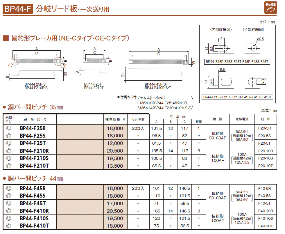BP44-F25R 分岐リード板 一次送り用 協約形ブレーカ用 銅バー間ピッチ 35mm