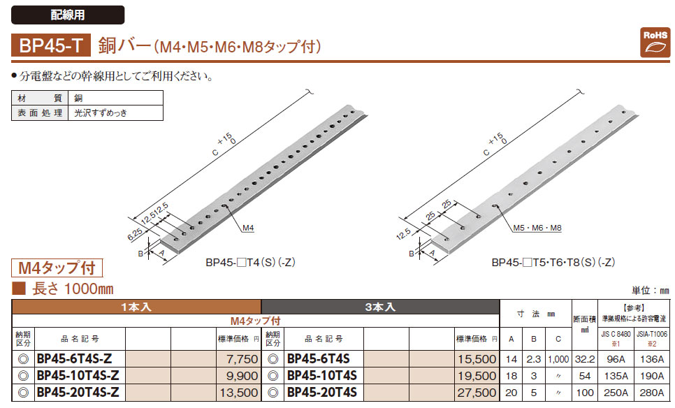 BP45-40T6S 銅バー 長さ1000mm M6タップ付 3本入