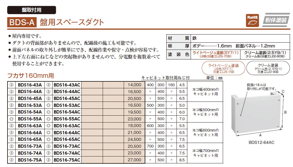 BDS16-43A 盤用スペースダクト フカサ160mm用