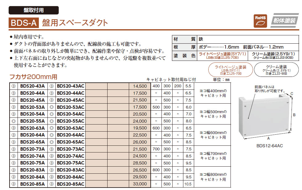 BDS20-73A 盤用スペースダクト フカサ200mm用
