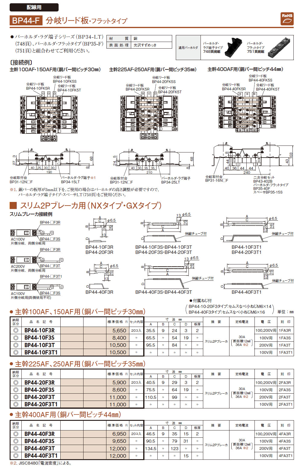 BP44-20F3R 分岐リード板 スリム2Pブレーカ用 主幹225AF、250F用